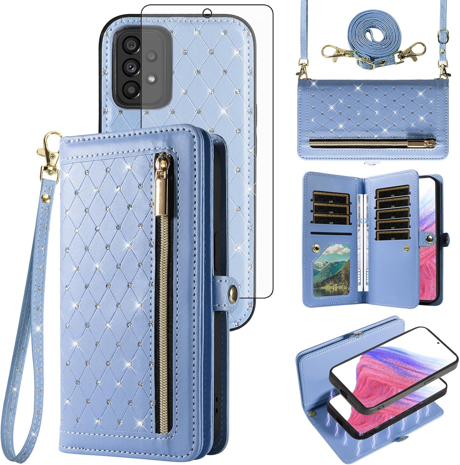 【Compatible Models】: Compatible with Samsung Galaxy A53 5G, NOT compatible with other devices.【Package includes】: We will send the phone case with 1 piece tempered glass screen protector + 1 detachable wrist strap + 1 detachable crossbody strap. Adjustable straps can help you find a comfortable length.It would be a nice gift for your lover, your family and your friends.【Support Detachable & Magnetic Car Mount】: You could use the removable back cover as a simple protective back cover alone, the back cover with built-in metal disk can be attached to a magnetic car phone holder, but please notice that it don't work with wireless charging.【Premium Service】:Asuwish provides 24 hours professional & nice customer service. if you have any doubts please feel free to contact us by mail,we will provide satisfied solutions to you.